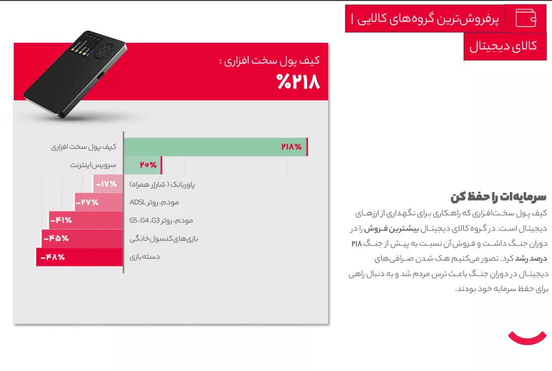 در بخش کالاهای دیجیتال، «کیف پول سختافزاری» با رشد فروش ۲۱۸ درصدی، به دلیل نگرانی از امنیت داراییهای دیجیتال در برابر تهدیداتی مانند هک صرافیهای آنلاین، مورد توجه قرار گرفت.