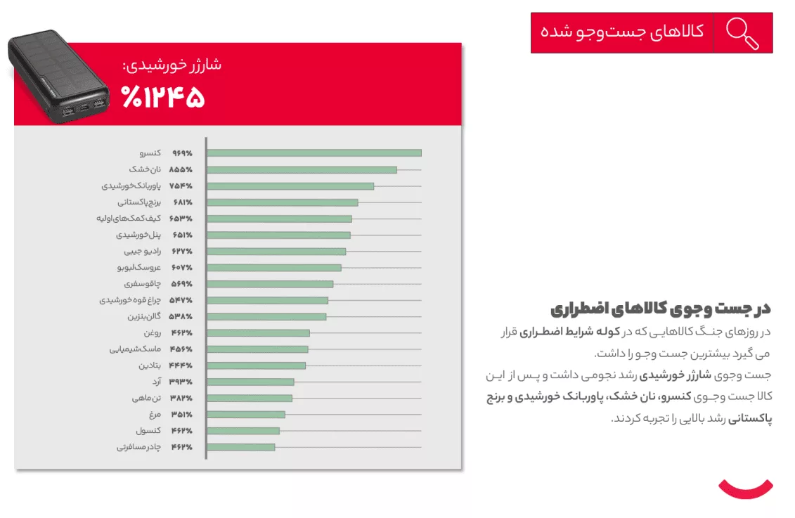 در طول این ۱۲ روز، رفتار خرید مردم به شدت تحت تأثیر فضای ناامنی و ترس قرار گرفت. با شروع بحران، تمرکز اصلی خریداران به تأمین اقلام ضروری برای بقا معطوف شد. دادههای دیجیکالا نشان میدهد که جستوجوی محصولاتی مانند «شارژر خورشیدی» با افزایش خیرهکننده ۱۲۴۵ درصدی مواجه شد، که نشاندهنده نگرانی گسترده از قطعی احتمالی برق بود.