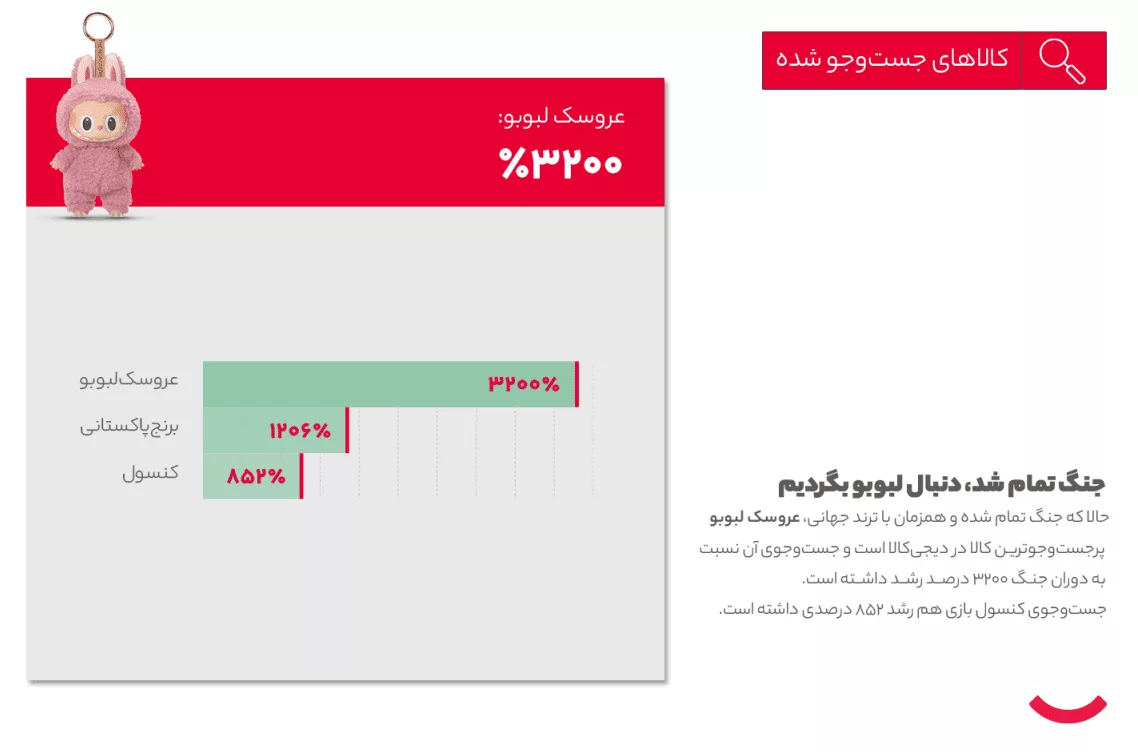 پس از پایان بحران، از ۶ تا ۲۴ تیرماه، رفتار خرید مردم به سرعت تغییر کرد و از تمرکز بر بقا به سمت سرگرمی و بازگشت به زندگی عادی چرخش یافت. یکی از بارزترین نشانههای این تغییر، افزایش ۳۲۰۰ درصدی جستوجوی «عروسک لبوبو» بود که این محصول را به پرجستوجوترین کالای دیجیکالا تبدیل کرد. این تغییر نشاندهنده تمایل جامعه به جبران فشار روانی روزهای بحرانی و بازگشت به روندهای تفریحی و جهانی بود.