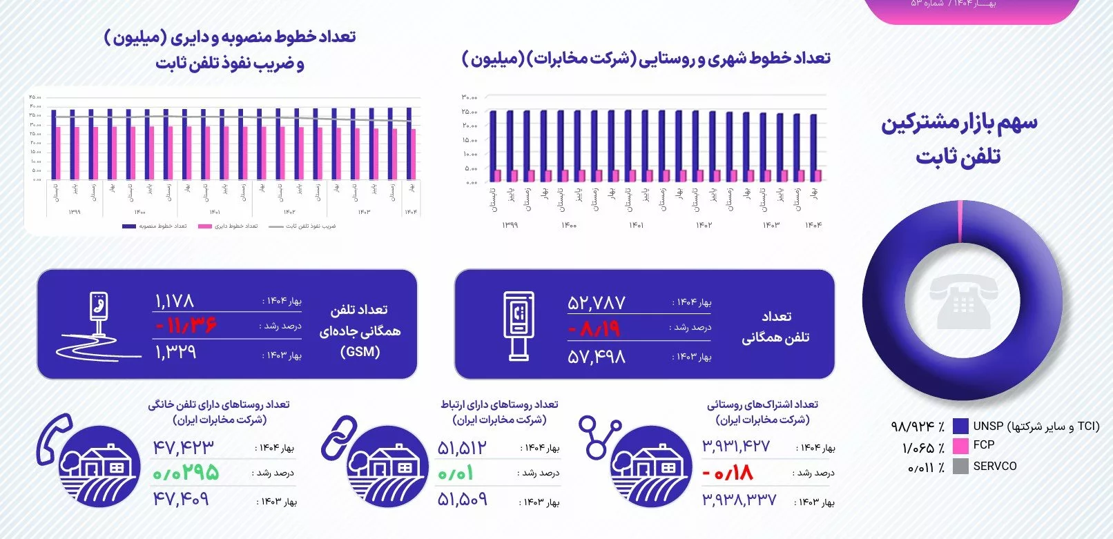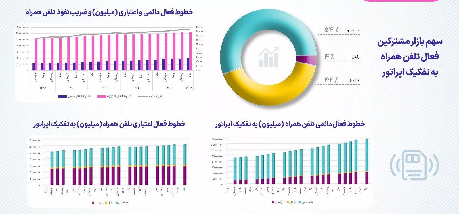 تا پایان خرداد ۱۴۰۴، تعداد خطوط فعال تلفن همراه در ایران به ۱۶۴ میلیون و ۱۹۲ هزار خط رسیده که نسبت به سال گذشته ۶.۰۵ درصد افزایش یافته است. در بخش پهنباند سیار نیز با رشد ۶.۴۱ درصدی، تعداد کاربران به ۱۲۱ میلیون و ۲۴۸ هزار نفر رسیده است. در مقابل، تعداد مشترکان تلفن ثابت با کاهش ۲.۳۴ درصدی و پهنباند ثابت با رشد اندک ۱.۴۷ درصدی به ۱۱ میلیون و ۲۶۹ هزار نفر رسیده است.