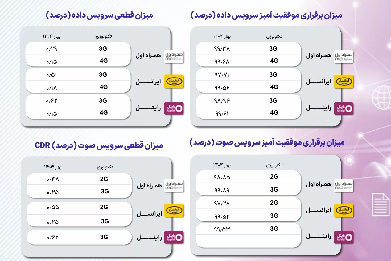 نرخ موفقیت اتصال به سرویس داده در همه اپراتورها بالای ۹۹.۵ درصد گزارش شده است. با این حال، شکایات کاربران (۹۷۶۵ مورد در بخش سیار و ۲۵۸۶۵ مورد در بخش ثابت) نشان میدهد که کیفیت اتصال و قطعی سرویس همچنان از دغدغههای اصلی است.