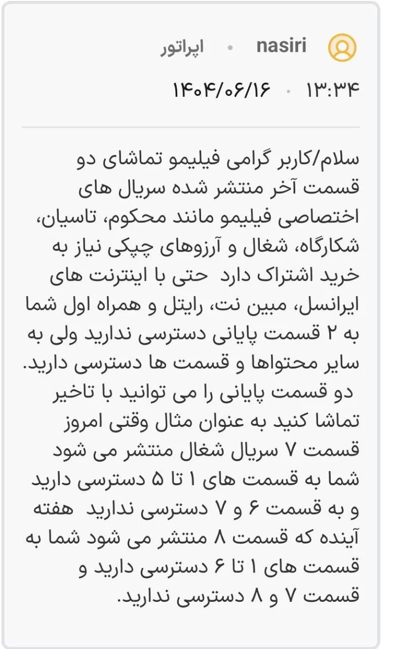بر اساس سیاست جدید پلتفرم فیلیمو، کاربرانی که از خدمات اپراتورهایی مانند ایرانسل، همراه اول، رایتل و مخابرات استفاده میکنند، دیگر نمیتوانند تمام قسمتهای سریالهای اختصاصی این پلتفرم را بهصورت رایگان تماشا کنند.