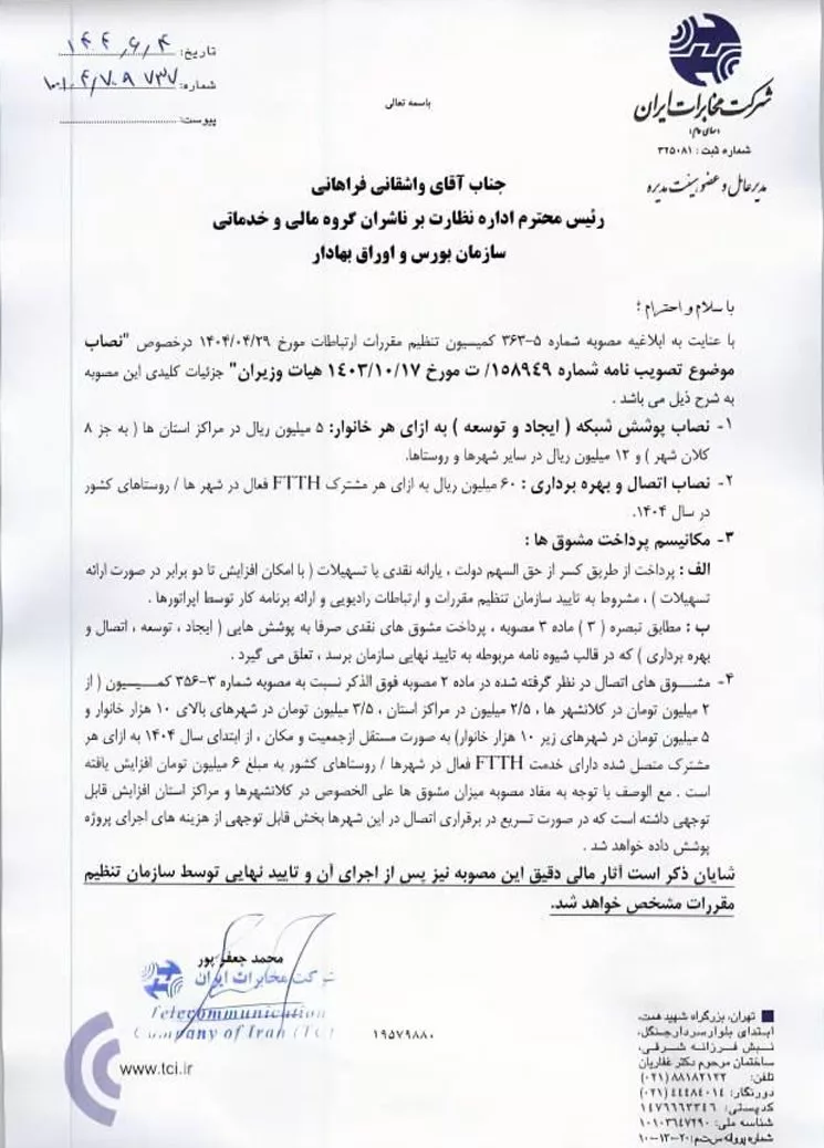 شرکت مخابرات ایران در نامهای رسمی به سازمان بورس، مصوبه جدید کمیسیون تنظیم مقررات ارتباطات درباره مشوقهای توسعه شبکه فیبر نوری (FTTH) را معرفی کرده است. براساس این مصوبه، مبلغ این مشوقها برای پوشش شبکه به ازای هر خانوار در مراکز استان (به جز کلانشهرها) معادل ۵ میلیون ریال، و در سایر مناطق به روستاها و شهرها معادل ۱۲ میلیون ریال تعیین شده است. علاوه بر این، برای هر مشترک FTTH فعال در سراسر کشور مبلغ ۶۰ میلیون ریال (معادل ۶ میلیون تومان) در سال ۱۴۰۴ در نظر گرفته شده است